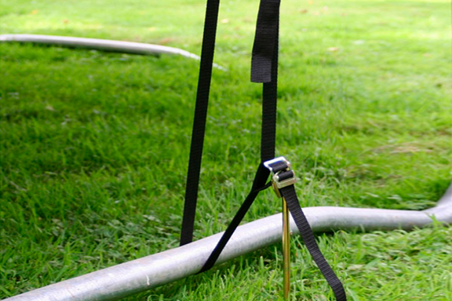 С помощью данного комплекта для крепления к земле вы с легкостью создадите батуту дополнительную безопасность и устойчивость. Он предотвратит перемещение батута, его опрокидывание или повреждение в случае сильного ветра. Набор включает в себя два металлических анкера и ремешки для крепления для вашего батута. Вы можете приобрести и установить дополнительные элементы крепления, особенно если у вас очень большой батут. Перед использованием батута, убедитесь, что ремни достаточно затянуты и что крепеж глубоко воткнут в землю. Длина анкера — 35,5 см.