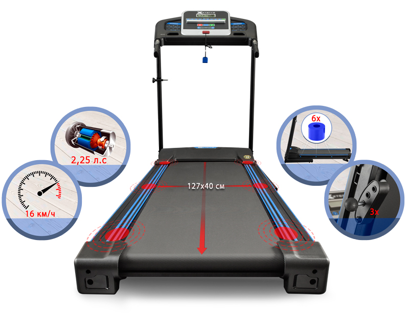 Бренд Xterra Тип для дома Использование домашнее Артикул TR150 Страна-производитель США Сборка КНР Конструкция складная Подключение к сети 220В Мощность двигателя л/с 2,25 Двигатель постоянного тока (DC) Изменение угла наклона ручное (3 уровня) Регулировка угла наклона ручная Максимальный вес пользователя (кг) 120 Беговое полотно многослойное (Habasit) Диаметр вала передний/задний (мм) 41,5 / 41,5 Измерение пульса датчики на рукоятках Размер бегового полотна (см) (Д х Ш) 127 х 40 Скорость (min-max) (км/ч) 1-16 Толщина деки (мм) 15 Уровень шума низкий - Консоль